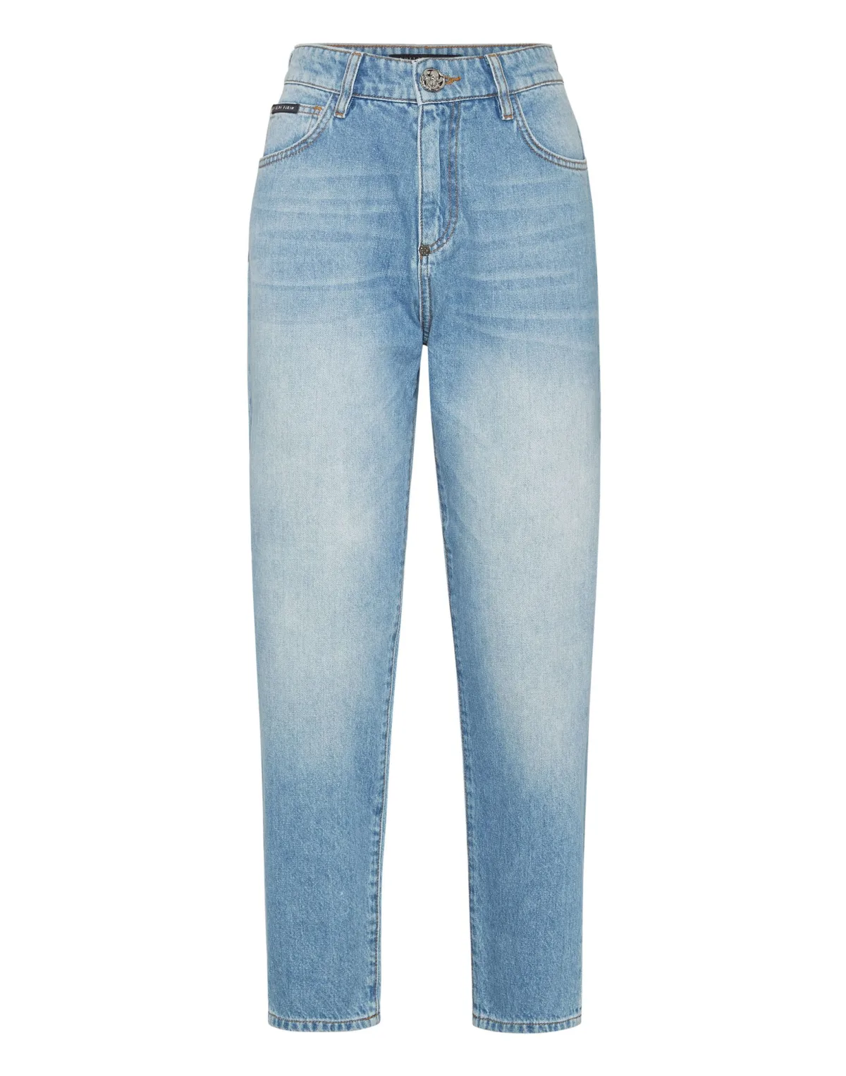 You want to stand out? Then, we suggest these stone washed denim 5 pocket pants with unique and precious details. Find out more. Denim Used wash Jewel ring on the belt loop at center back Logoed patch sewn on the back Single metal jewel button Fit: Mom