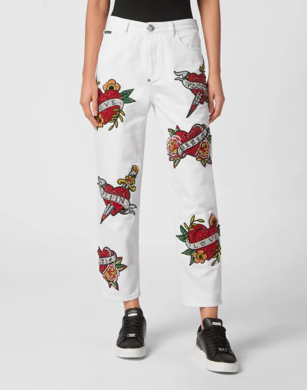 Verfraaid Stijl en comfort met deze stone washed denim 5 pocket broek met een nieuwe pasvorm. Ontdek meer. Stone washed denim Rhinestoned Love Tattoo patches Enkele metalen juweelknoop Pasvorm: Ma