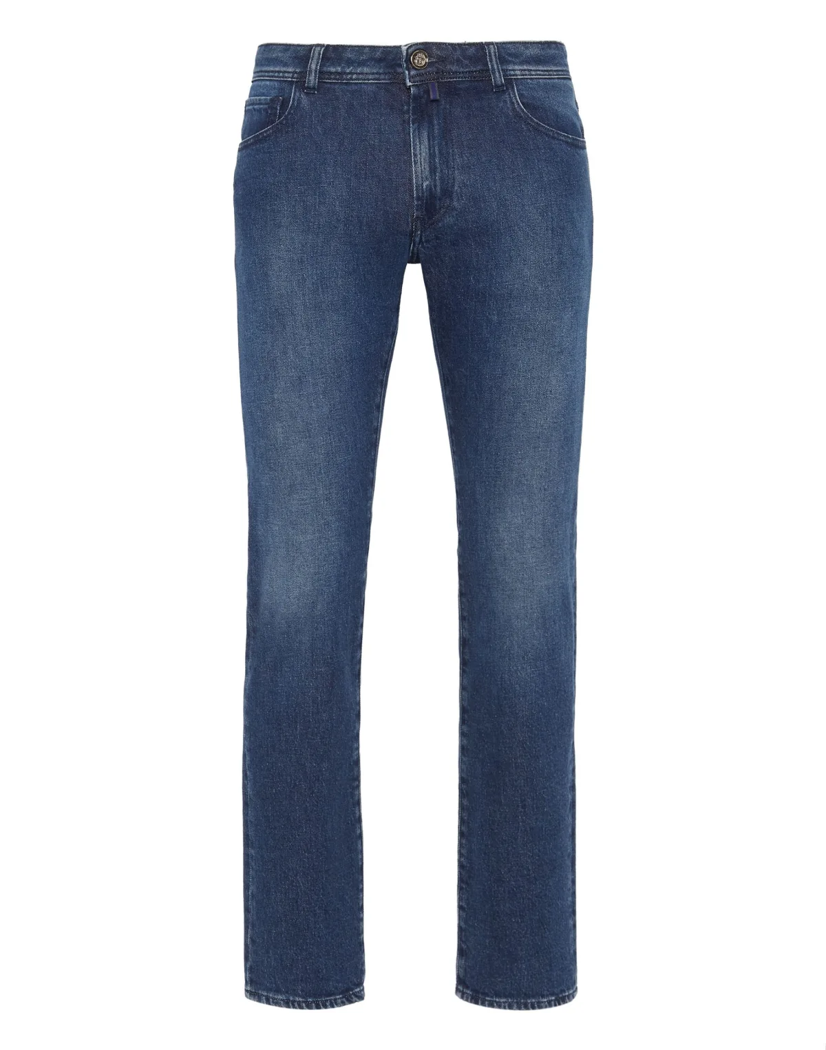 Denim 5 pocket pants. Stone washed denim Patterns printed on the back Logoed Maxi label sewn on the back of the waistband Single metal button Fit: Super Straight