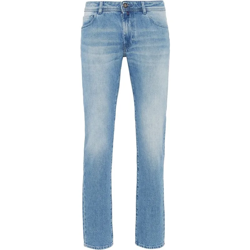 Denim 5 pocket pants. Stone washed denim Patterns printed on the back Logoed Maxi label sewn on the back of the waistband Single metal button Fit: Super Straight