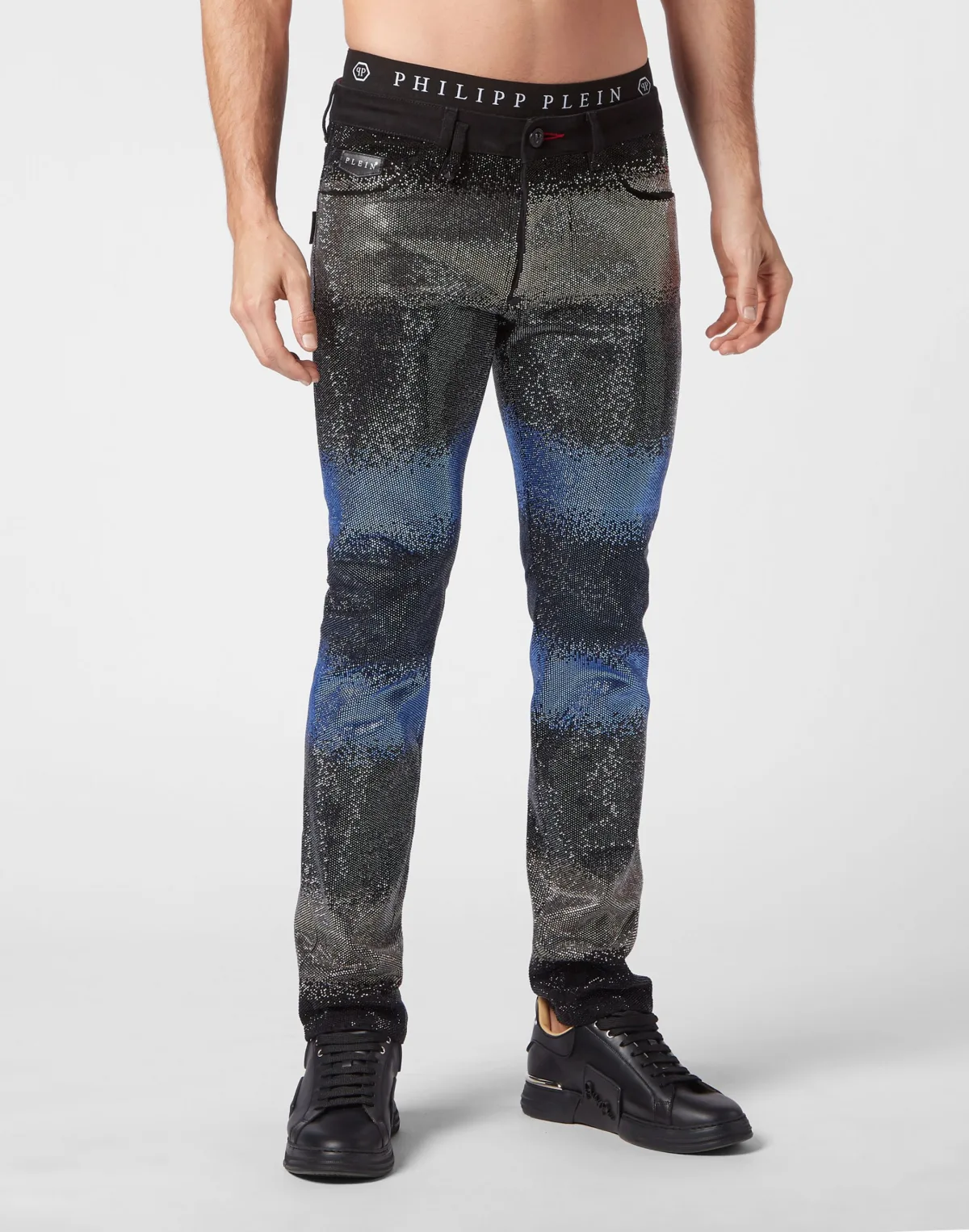 Verfraaid Geef je look een vleugje glamour met deze kostbare denim broek. Ontdek de kenmerken. Met strass-steentjes ingelegde stretchdenim PP Hexagon op een saffiaanleren patch op de rechterachterzak Enkele metalen knoop Label met logo op de achterkant van de tailleband Pasvorm: Super recht