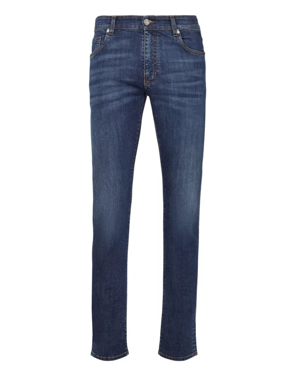 These stretch stone washed denim 5 pocket pants feature the brand's monogram embroidered in a Baroque style on the right rear pocket. Zipper and metal button at waist feature the Maison's coat of arms. Bonded leather label on the back with laminated print. Tobacco stitching. Fit: Super Straight. Bottom: cm 18