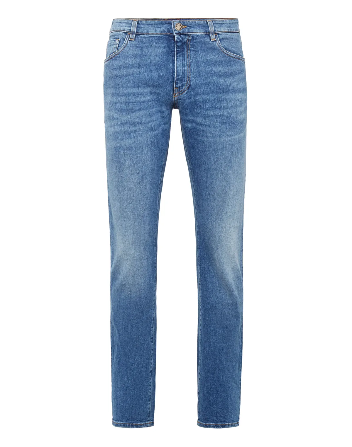 Billionaire geeft zijn meest iconische symbool niet op: zijn wapenschild. Op deze stretch stone washed denim 5 pocketbroek is het met satijn gestikt op de rechter achterzak. De ritssluiting en metalen knoop in de taille zijn voorzien van het wapen van het huis. Gelamineerd leren label op de achterkant. Stiksels in tabak. Pasvorm: Super recht. Onderkant: cm 18