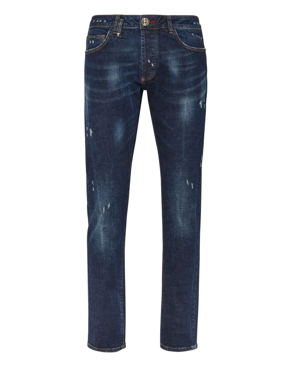 Geef je look een vleugje uniciteit met deze denim broek met 5 zakken en een kostbaar detail. Stone washed denim met een strass hart geborduurd op een patch Rips en slijtage PP Hexagon op een leren patch genaaid op de rechter achterzak Enkele metalen knoop Pasvorm: Super recht