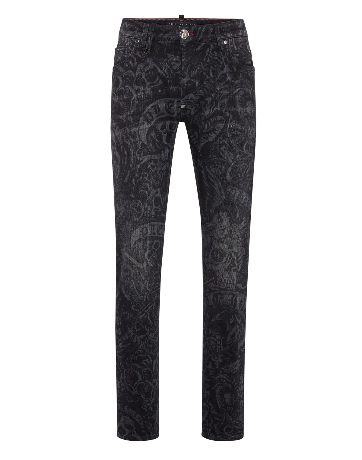Escape the routine and pick something really unique, like these patchwork denim 5 pocket pants. All over laser printed denim with Tattoo pattern Patchwork with striking seams Single metal button PP Hexagon on a saffian leather badge sewn on the right rear pocket Fit: Super Straight