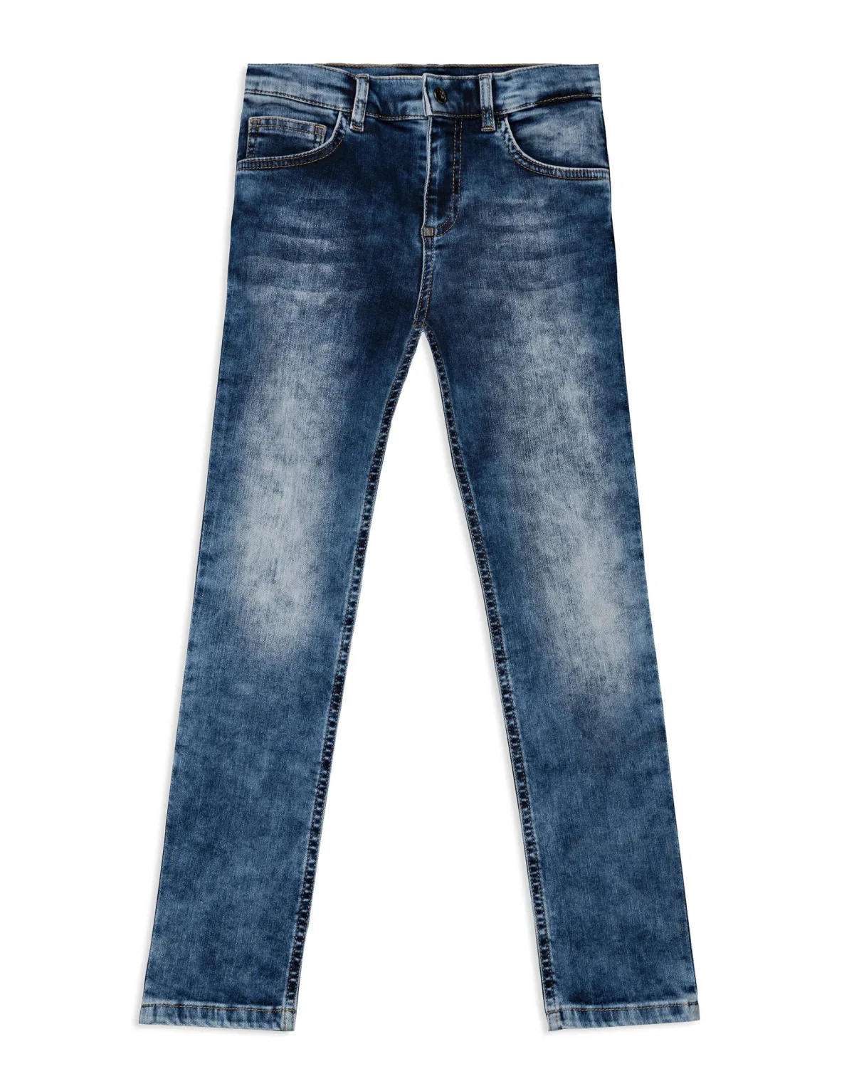 Stone washed denim five pockets trousers with overall whiskering and faded patterns. Metal button and rivets. Embroidered crest patched at back right pocket.