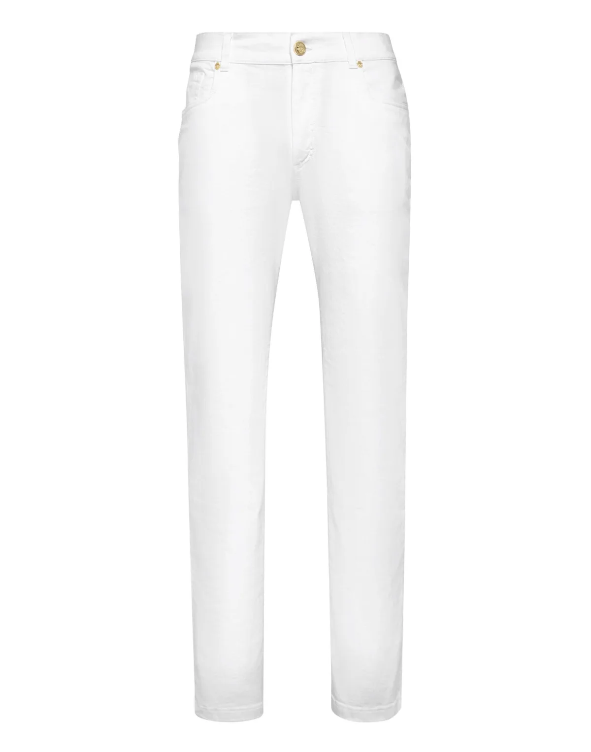 Deze stone washed denim broek met 5 zakken heeft het monogram van het merk geborduurd op de rechter achterzak. De ritssluiting en metalen knoop in de taille zijn voorzien van het wapen van Maison. Gelamineerd leren label op de achterkant. Stiksels in tabak. Pasvorm: Regular. Onderkant: cm 22