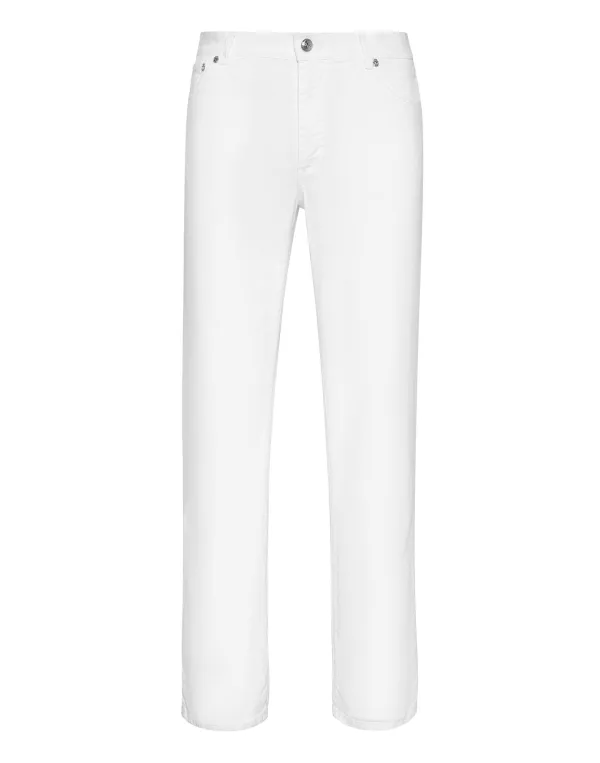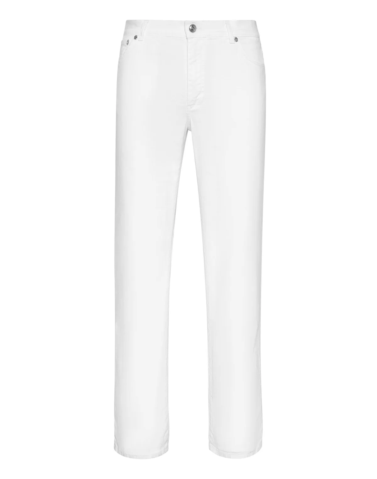 De stretch stone washed denim 5 pocket broek van dit seizoen heeft metalen klinknagels in de vorm van het merkwapen. De ritssluiting en de knoop in de taille hebben dezelfde vorm. Het iconische monogram staat in het borduursel in barokstijl op de rechterachterzak. Pasvorm: Regular. Onderkant: 22 cm.