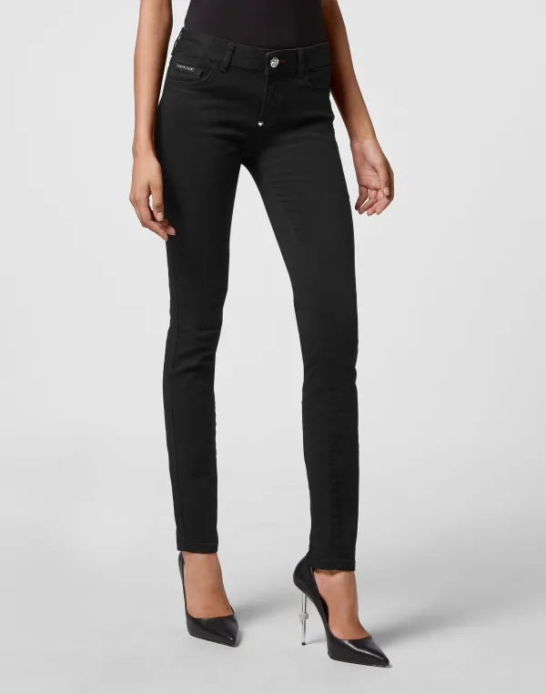 Stretch stone washed denim 5 pocket jeggings. Enkele metalen knoopsluiting.