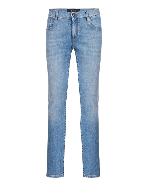 These stone washed denim 5 pocket pants, as part of the new collection, feature the leather double B logo on the right rear pocket. Zipper fastening and one metal button with the Maison’s emblem. Bonded leather label on the back with a laminated print. Tobacco stitching. Fit: Super Slim. Bottom: 17 cm.