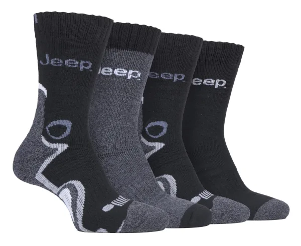 Jeep sokken zijn vervaardigd en ontworpen voor het buitenleven. Voor dikke, duurzame en betrouwbare sokken zijn deze herensokken uit het Jeep-assortiment iets voor jou. Deze Jeep-collectie is ontworpen voor de actieve man die graag zijn tijd doorbrengt in ruig terrein - met gespecialiseerde sokken beschikbaar voor wandelen, wandelen en skiën. Een selectie van Jeep-sokken voor heren is ook verkrijgbaar in geschenkverpakkingen, waardoor ze een geweldig cadeau zijn voor die actieve man in je leven. Laat je voeten ademen in deze zachte badstof gewatteerde polykatoenmix laarzensokken. Verkrijgbaar in een set van 4, deze hoogwaardige polyester sokken zijn ideaal om te dragen voor dagelijkse buitenactiviteiten. Of je nu op pad gaat voor een lange trektocht of een korte wandeling, deze sokken hebben een elastisch ondersteuningssysteem voor de voetboog dat zit goed op je huid. Deze sokken zorgen voor schokbescherming, schokabsorptie, vochtregulatie en bootvullende warmte, met ondersteuning door hun zachte en ademende eigenschappen. Deze sokken zijn gemaakt van 68 % polyester, 28% katoen, 4% viscose, 1% elastodieen. Ze zijn verkrijgbaar in de maten 39-45 EU. Ze zijn verkrijgbaar in zwart/houtskool, bruin/aarde, houtskool/grijs. Ze worden geleverd in een verpakking van 4.