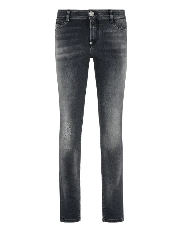 Laat je figuur zien met deze stretch stone washed denim 5 pocket jeggings met een distressed effect. Dit kledingstuk is ontworpen om je lichaam vorm te geven. Geniet van de enkele juweelknoop in de taille en de PP Hexagon die op de rechterachterzak is genaaid. Gestikt met twee naalden.
