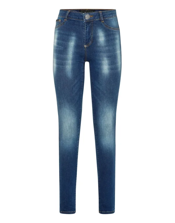Stretch stone washed denim 5 pocket jeggings. Enkele metalen knoopsluiting.