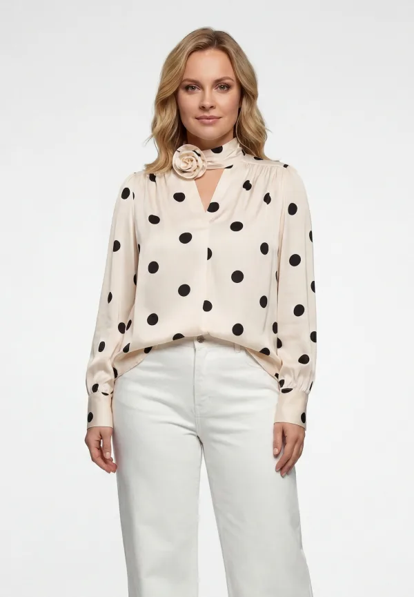 Blouse type: Blouseshirt; Design: Gevoerde zoom/rand; Materiaal: Satijn; Motief: Gestippeld; Details: Gedrapeerd; Extra's: Applicaties, Gladde stof; Pasvorm: Normale pasvorm; Armlengte: Lange mouw; Lengte: Normale lengte