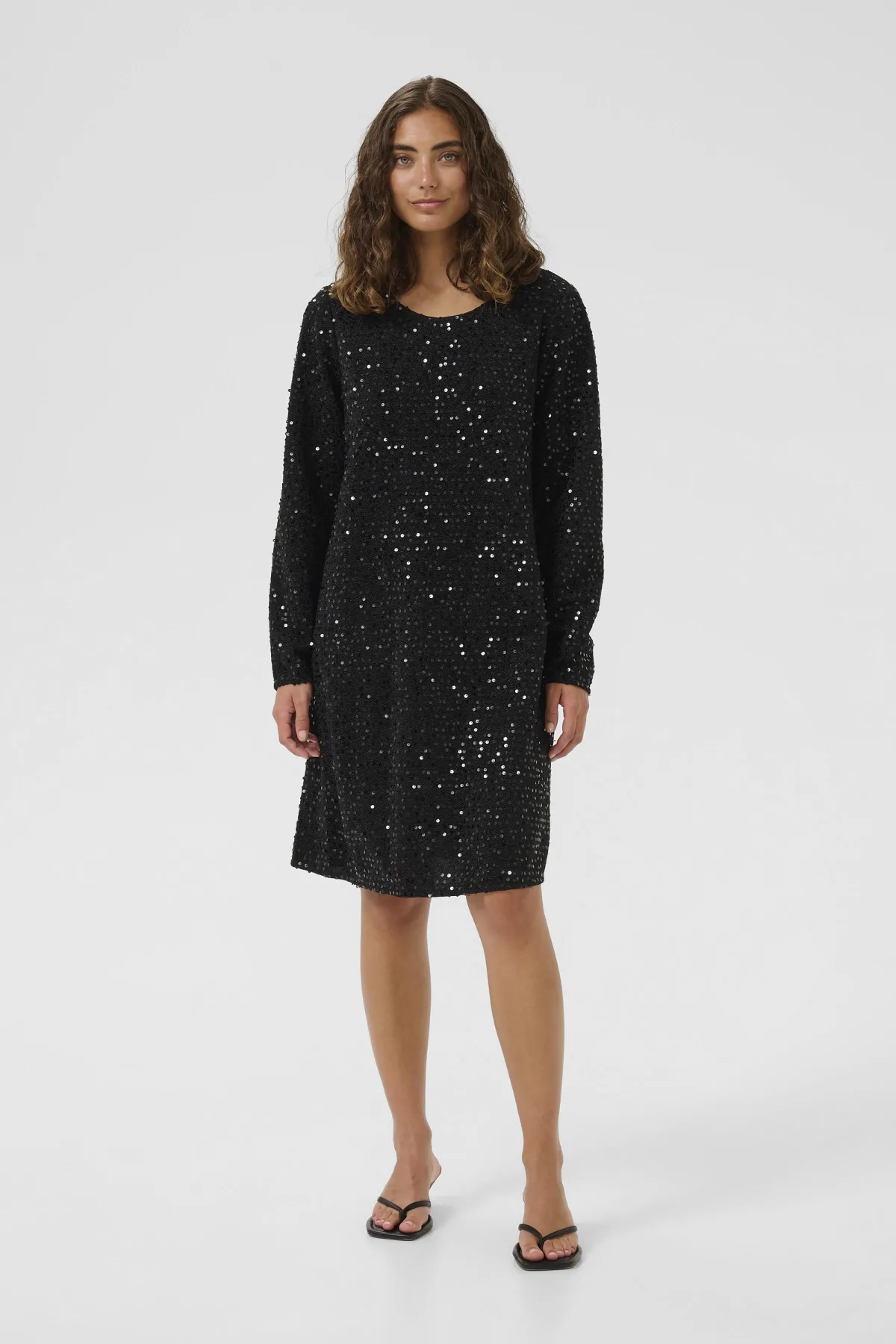 Paillettenjurk met rechte pasvorm, lange mouwen en een ronde halslijn. De jurk is volledig voorzien van pailletten en valt tot op de knie.