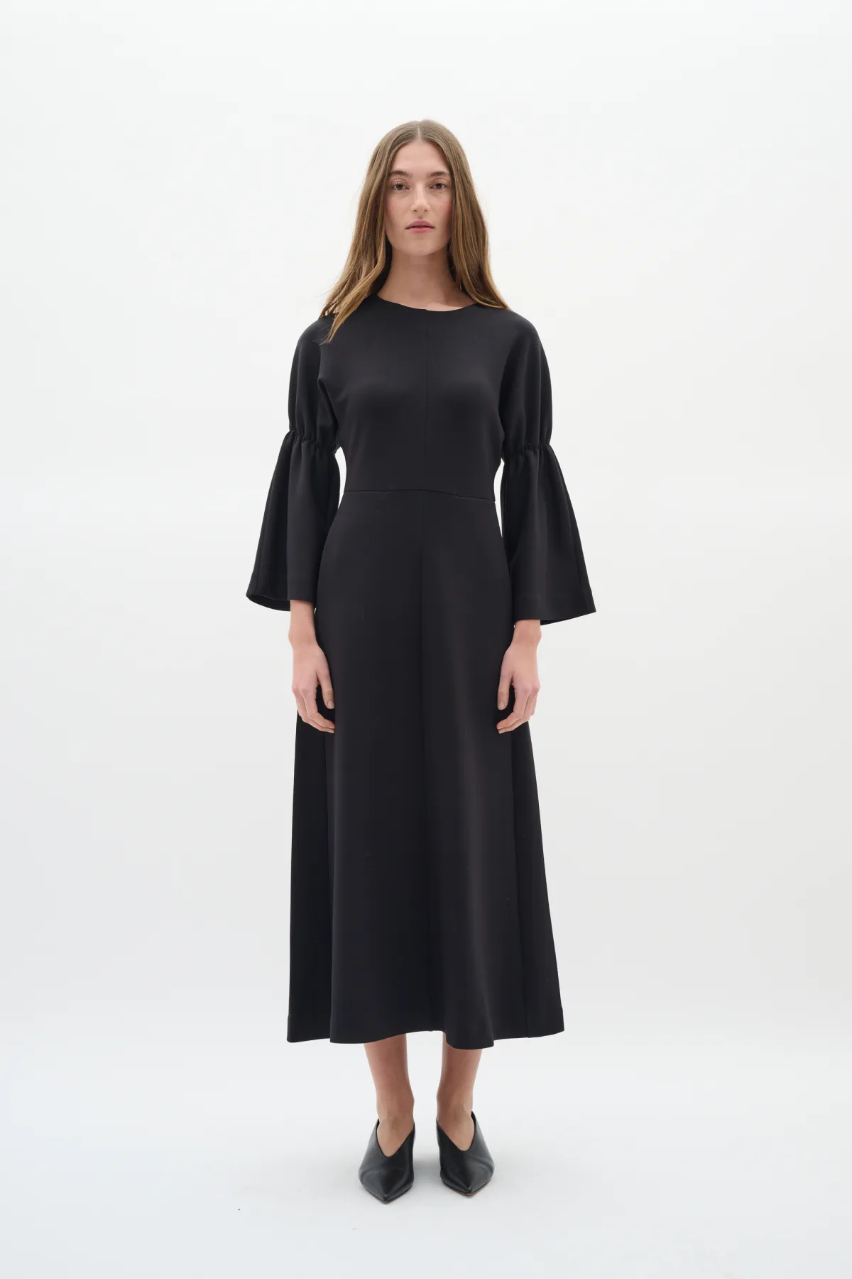 Deze midi-jurk biedt een getailleerde pasvorm met ronde halslijn en geplooide ballonmouwen. Comfortabel en geschikt voor elke gelegenheid. Fijne was 30°, niet bleken, niet in de droger drogen, Liggend laten drogen., koud strijken max. 110° C, 51% Modal (TENCEL™),42% Polyester,7% Elastaan
