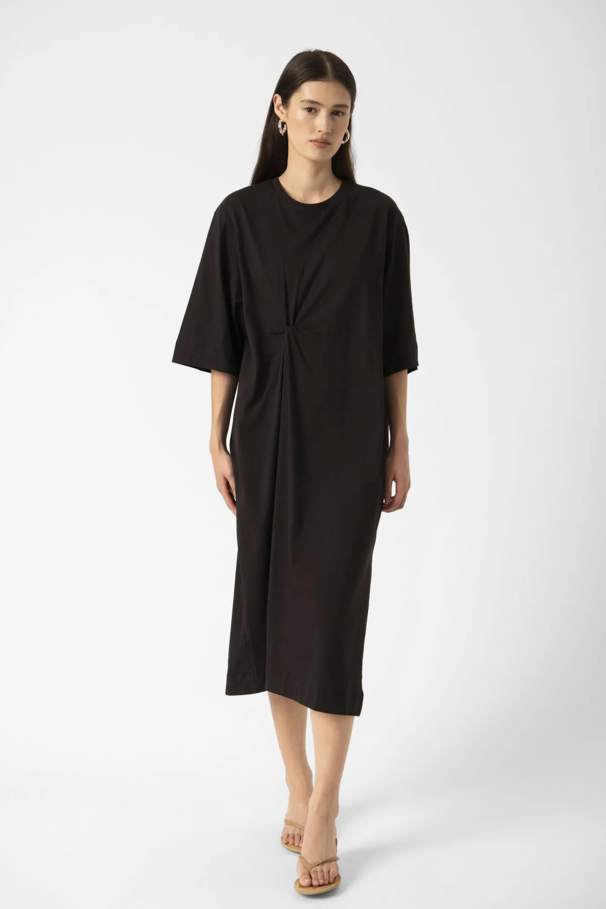 Deze midi-jurk met relaxte pasvorm, ronde halslijn en korte wijde mouwen biedt extra comfort. De elegante plooidetail in de taille accentueert het silhouet. Wassen op 30°, niet bleken, niet in de droger drogen, Druipnat ophangen in de schaduw, koud strijken max. 110° C, 100% Katoen