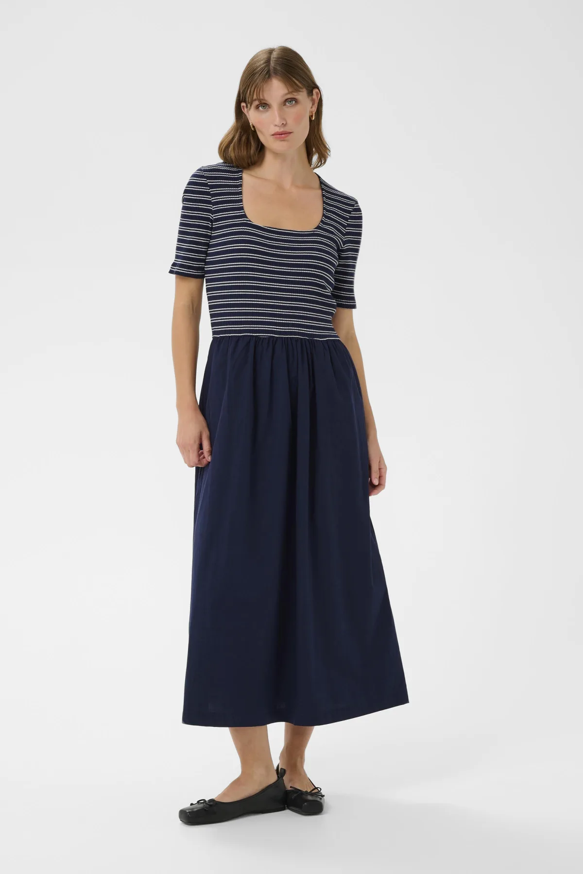 Midi-jurk met aansluitend, gestreept rib bovenlijf en vierkante halslijn. Gecombineerd met een wijde, gerimpelde A-lijn rok voor een modern silhoutte.