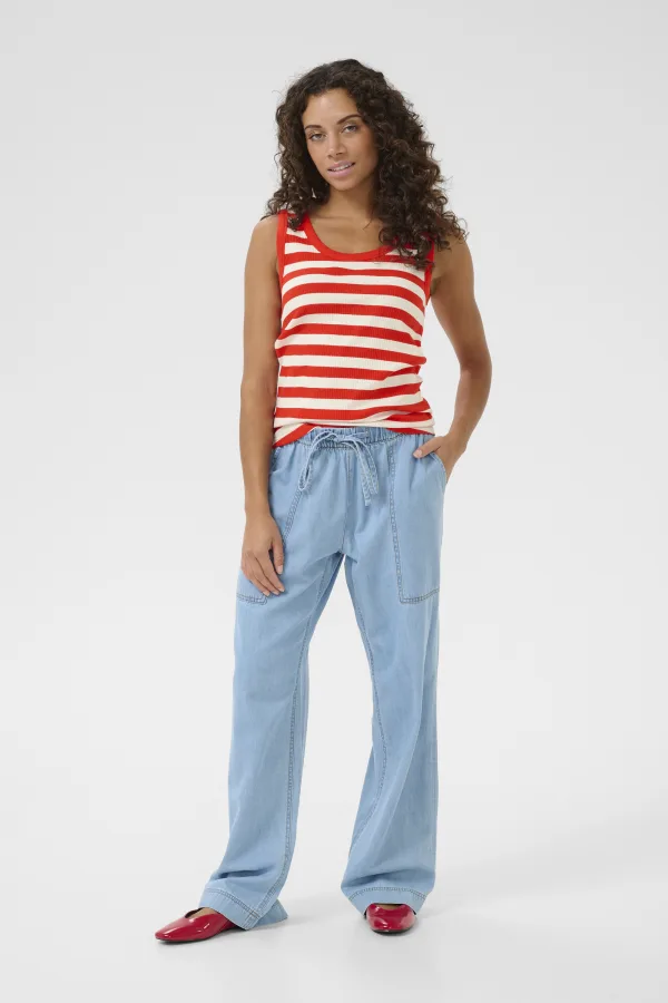 Gestreepte tanktop met aangesloten pasvorm en ribbelstructuur. Voorzien van brede schouderbanden, ronde hals en rechte zoom op taillehoogte.
