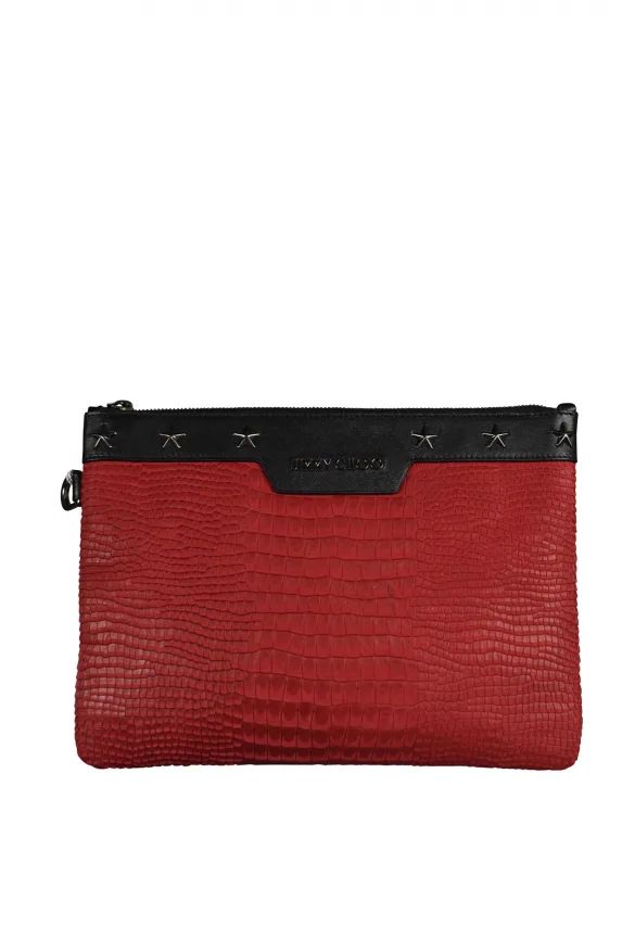 Jimmy Choo Derek clutch.In rood leer gestempeld krokodil en zwart leren detail.Binnenzakken en ritssluiting. Jimmy Choo logo op de bovenkant met sterren met studs.Afmetingen: 29 x 21 cm. Gemaakt in Italië.