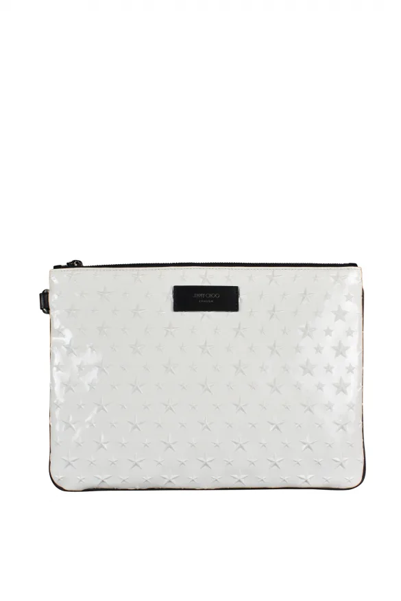 Derek Jimmy Choo clutch van wit lakleer.Witte sterren in reliëf op de hele clutch.Zwart detail op de omtrek van de clutch.Binnenzakken en ritssluiting.Jimmy Choo-logo op de bovenkant.Afmetingen: 29 x 21 cm. Gemaakt in Italië.