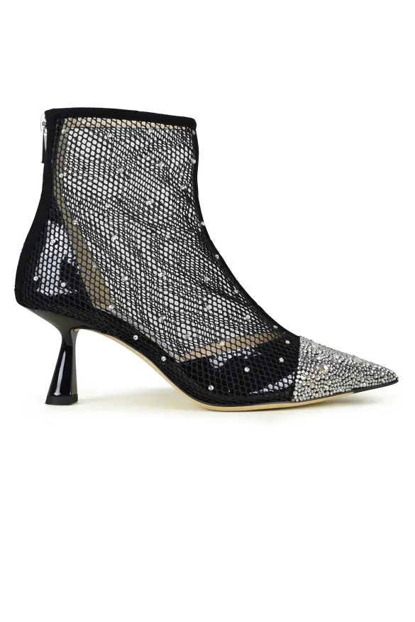 Kix 65 Jimmy Choo enkellaarsjes in zwart mesh.Puntpunt met kristallen versieringen.Kristaldetails op de schoen gestippeld.Hakhoogte 6,5 cm.Leren binnenzool en voering.Ritssluiting aan de achterkant.Made in Italy.