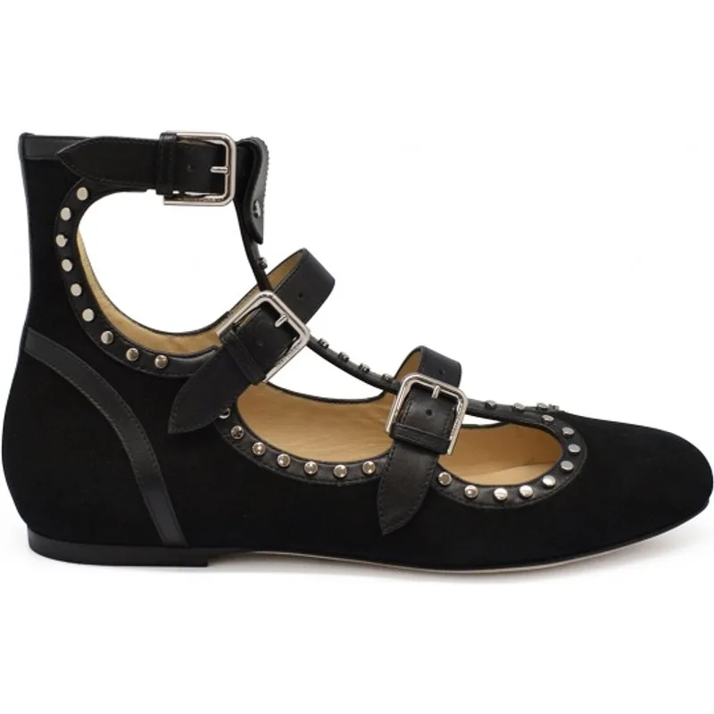 Jimmy Choo Hartley ballerina's van zwart suède en leer met studs.Drievoudige gesp.Leren zool.Gemaakt in Italië.