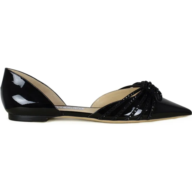 Jimmy Choo Kaitence Flat in zwart lakleer en suède met met kristallen versierde strik.Leren zool.Gemaakt in Italië.