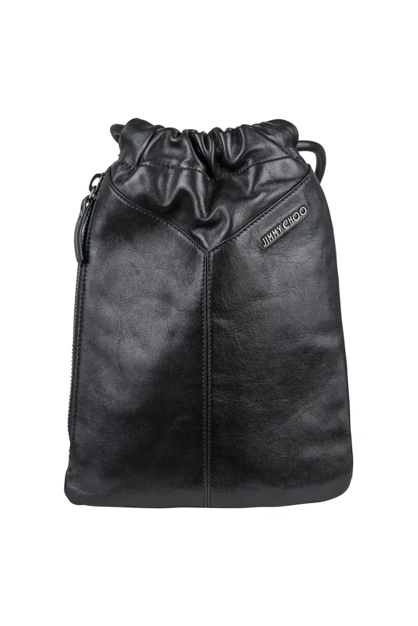 Jimmy Choo handtas van zwart leer.Ritssluiting en ton-sur-ton logo op de voorkant.Zwart leren trekkoorden.3-delig juk.Afmetingen: 28 x 21 x 2 cm.Gemaakt in Italië.