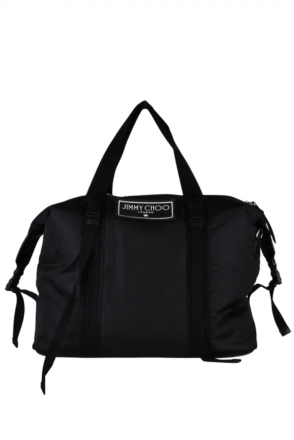 Jimmy Choo Arlington draagtas van zwart nylon.Twee nylon handvatten.Een handvat om als schoudertas te dragen.Twee afneembare nylon banden.Zilveren Jimmy Choo-logo op de voorkant.Ritssluiting.Stoffen binnenzak.100% katoen.Gemaakt in Italië.