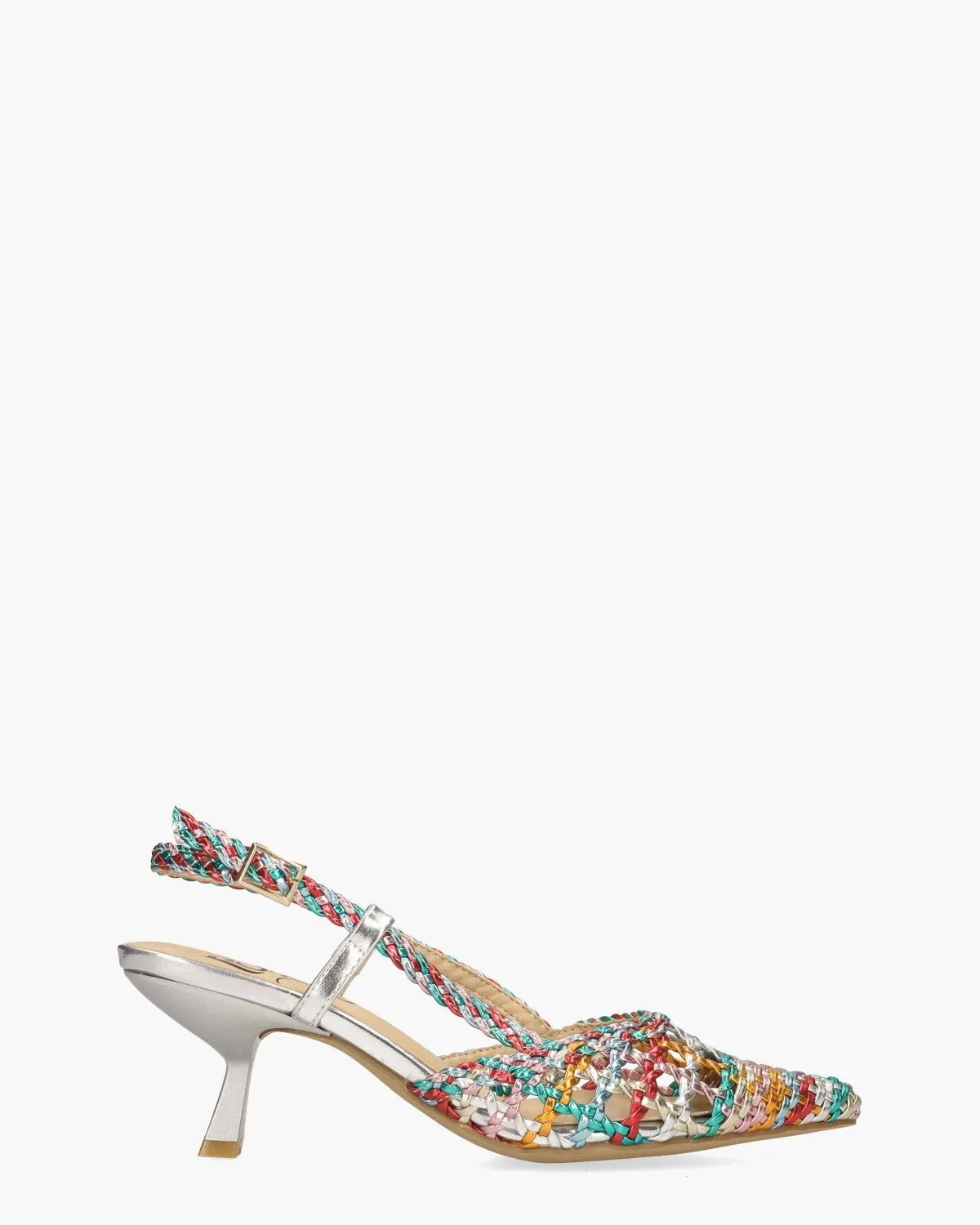 Kleur, glans en elegantie komen samen inéén ontwerp. De Lisa&Jo Waqi is een opvallende slingbackpump met een bovenwerk van metallic leer in een multi en zilverkleurige uitvoering. De verfijnde vlechtstructuur geeft de pump een unieke uitstraling. De 5 cm hoge queeniehak is gemaakt van zilver kunststof en biedt een elegante