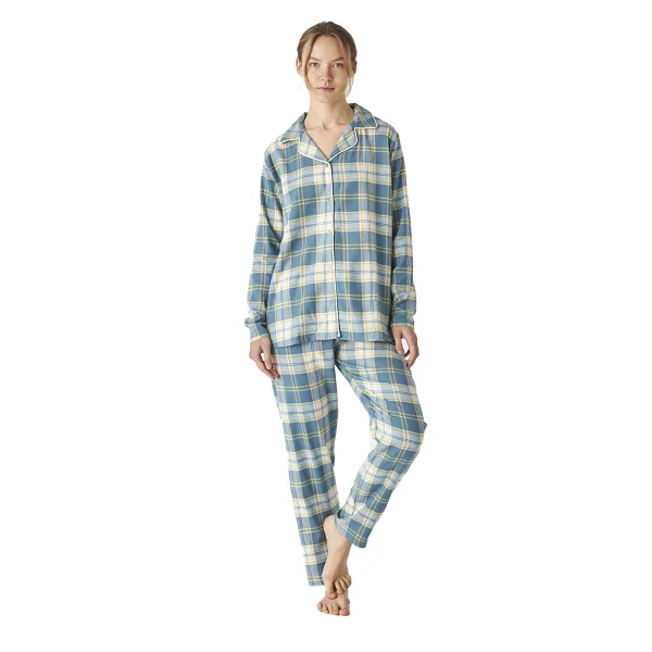 Damespyjama met lange mouwen en een elegant en comfortabel ontwerp, ideaal om in te loungen of thuis te ontspannen. Het moderne en geraffineerde ontwerp past perfect bij het vrouwelijke figuur, waardoor het silhouet wordt benadrukt met een chique en ontspannen stijl. De set bestaat uit een top met lange mouwen en knopen aan de voorkant, die praktisch en stijlvol is. De lange broek heeft een losse pasvorm en een elastische tailleband die kan worden aangepast met trekkoorden. Bovendien hebben zowel de top als de broek een geruite print, die een klassieke touch toevoegt. De hele pyjamaset is gemaakt van katoen, een zacht en ademend materiaal dat perfect is voor elk jaargetijde. Gemaakt van lichte en zachte materialen, perfect voor elke tijd van het jaar. Samenstelling: T-shirt: 100% Katoen; Broek: 100% Katoen Onderhoud: -Koud wassen in de wasmachine op een zacht programma om slijtage van de vezels te voorkomen. -Geen bleekmiddel of witmakers gebruiken. -Drogen aan de lijn of in de droogtrommel op lage temperatuur om krimp of vormverlies te voorkomen. -Strijken op lage temperaturen.