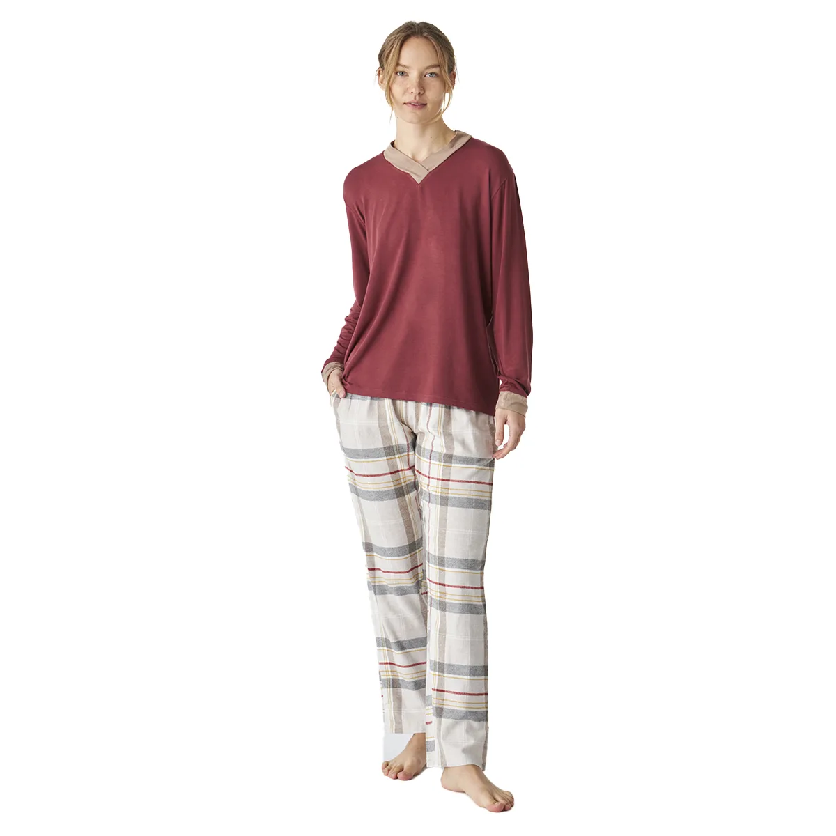 Damespyjama met lange mouwen en een elegant en comfortabel ontwerp, ideaal om in te loungen of thuis te ontspannen. Het moderne en geraffineerde ontwerp past perfect bij het vrouwelijke figuur, waardoor het silhouet wordt benadrukt met een chique en ontspannen stijl. De set bestaat uit een top met lange mouwen en een lichte V-hals. De lange broek heeft een losse pasvorm en een elastische tailleband met een geruit dessin dat zorgt voor een klassieke en toch moderne look, perfect gecombineerd met de effen top. Deze pyjama is ontworpen om maximaal comfort te bieden tijdens het rusten. Hij is gemaakt van lichte en zachte materialen en is perfect voor elk moment van het jaar. Samenstelling: T-shirt: 95% Modal, 5% Elastaan; Broek: 95% Modal, 5% Elastaan Onderhoud: -Koud wassen in de wasmachine op een zacht programma om slijtage van de vezels te voorkomen. -Geen bleekmiddel of witmakers gebruiken. -Drogen aan de lijn of in de droogtrommel op lage temperatuur om krimp of vormverlies te voorkomen. -Strijken op lage temperaturen.