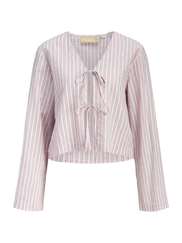 Blouse type: Klassieke blouse; Design: Gevoerde zoom/rand, Om te knopen/binden; Materiaal: Katoen; Motief: Gestreept; Kraag: Zonder kraag; Details: Cut-outs; Extra's: All-over patroon, Voelt zacht aan; Pasvorm: Normale pasvorm; Armlengte: Lange mouw; Lengte: Normale lengte