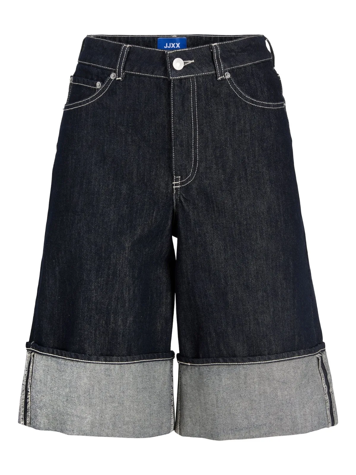 Design: Ritssluiting; Type sluiting: Ritssluiting; Materiaal: Denim; Motief: Effen; Extra's: Riemlussen; Wassing: Rinsed/dark washed; Lengte: Knielengte; Pasvorm: Wide leg; Taillehoogte: Mid waist