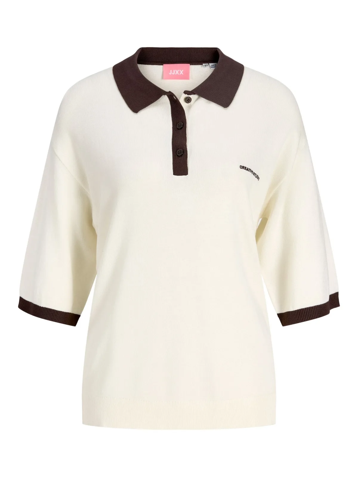 Design: Geribd ceintuurtje, Overcut schouder; Materiaal: Knitwear; Halstype: Polokraag; Extra's: Label print; Pasvorm: Wijde pasvorm; Armlengte: Kwartmouw; Lengte: Normale lengte