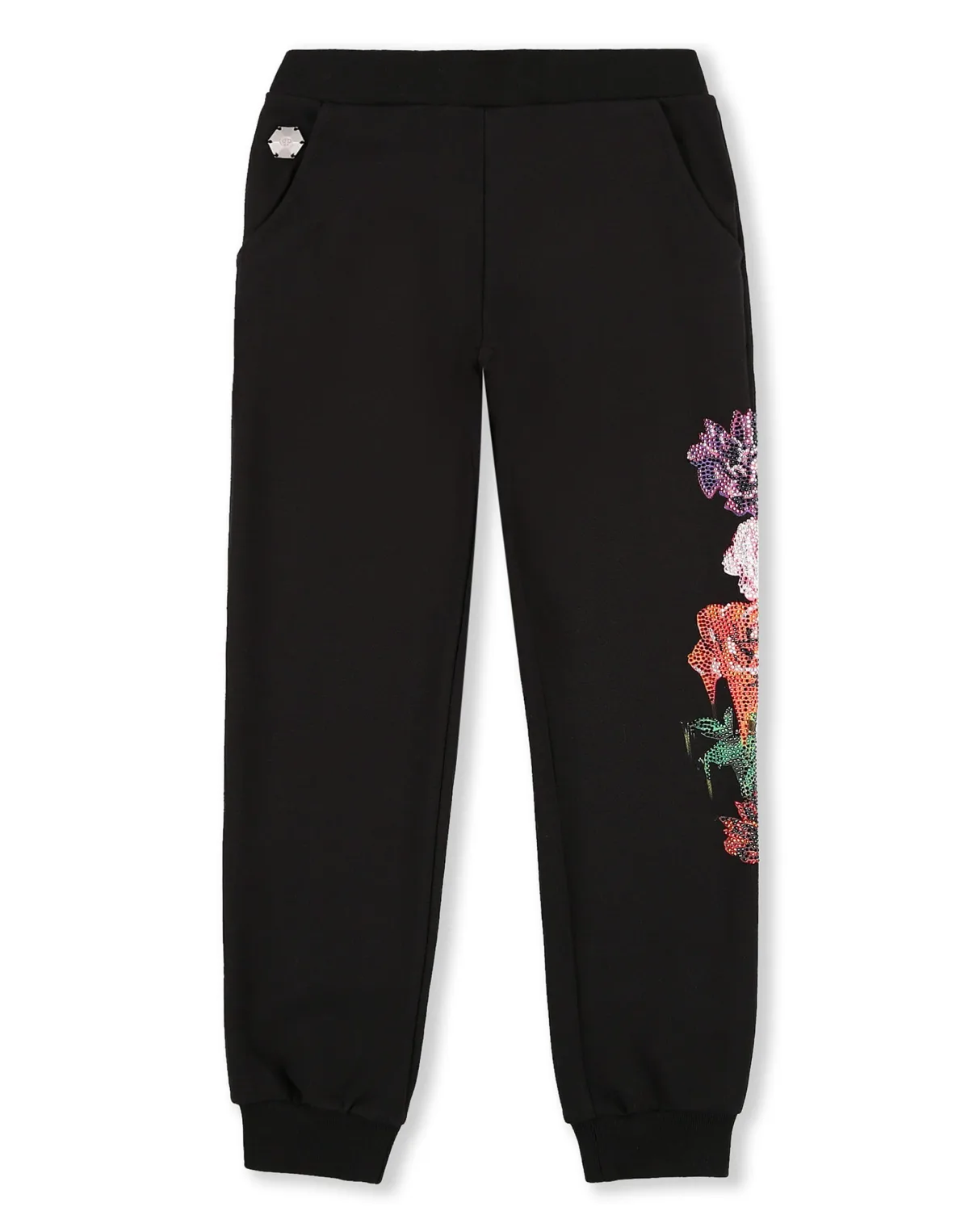 Verfraaid Katoenen fleece joggers met strass-bloemdecoraties. Twee paspelzakken. Ribgebreide tailleband en manchetten onderaan.