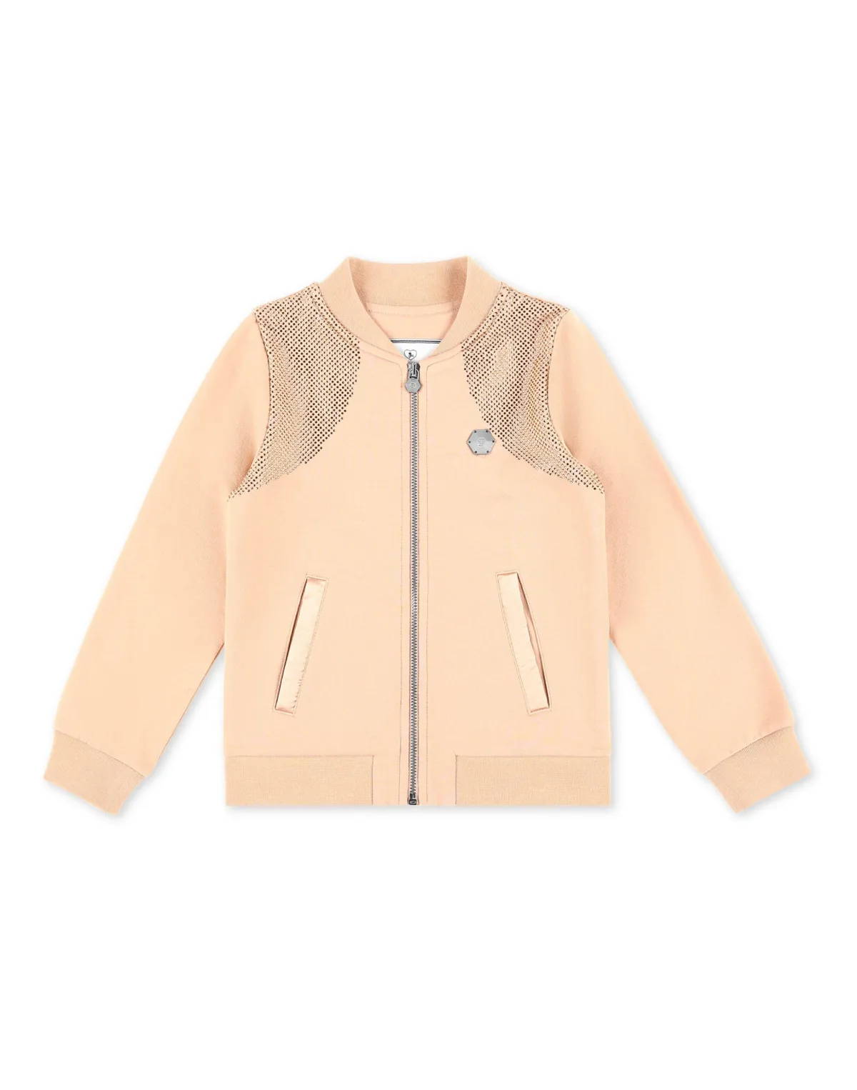 Cotton fleece sweatjacket featuring rhinestone applications and shiny satin details. The brand’s lettering is embroidered on the back. The metal PP Hexagon is sewn at left chest. Zipper fastening and two welt pockets. Rib knit collar and hems.