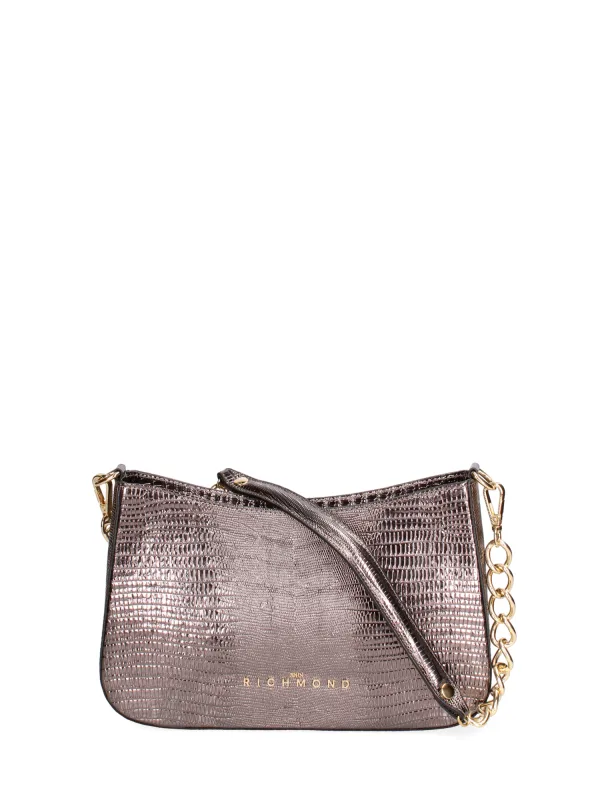 Damesschoudertas met ritssluiting. één met binnenzakken met ritssluiting. afwezige externe zakken. ontbrekende schouderband. afneembaar in ketting en leren handvat. een binnencompartiment. extern materiaal. gevoerd met 70% katoen - 30% polyester binnenkant. Afmetingen: 28x16x7,5 cm. Gemaakt in Italië