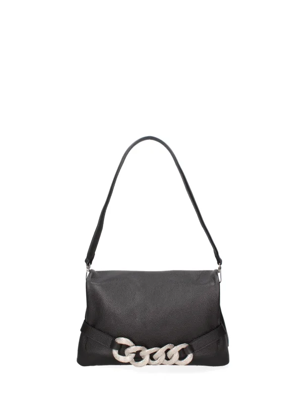 Damesschoudertas met magnetische knoopsluiting. één met ritssluiting en twee open binnenzakken. afwezige externe zakken. verstelbare en afneembare lederen schouderband. afneembaar leren handvat. twee binnenvakken. extern materiaal. 100% echt lederen interieur. Afmetingen: 27x17x11 cm. Gemaakt in Italië