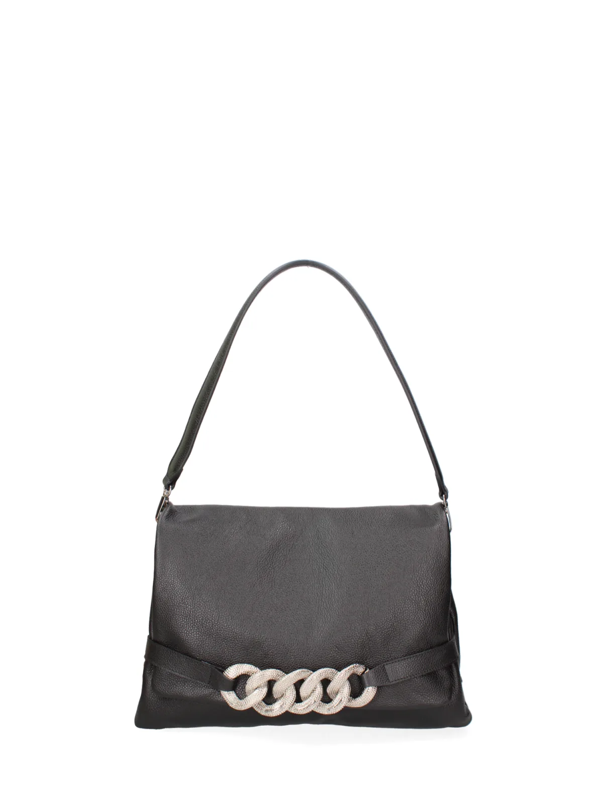 Damesschoudertas met magnetische knoopsluiting. één met ritssluiting en twee open binnenzakken. afwezige externe zakken. verstelbare en afneembare lederen schouderband. afneembaar leren handvat. twee binnenvakken. extern materiaal. 100% echt lederen interieur. Afmetingen: 31x22x11 cm. Gemaakt in Italië
