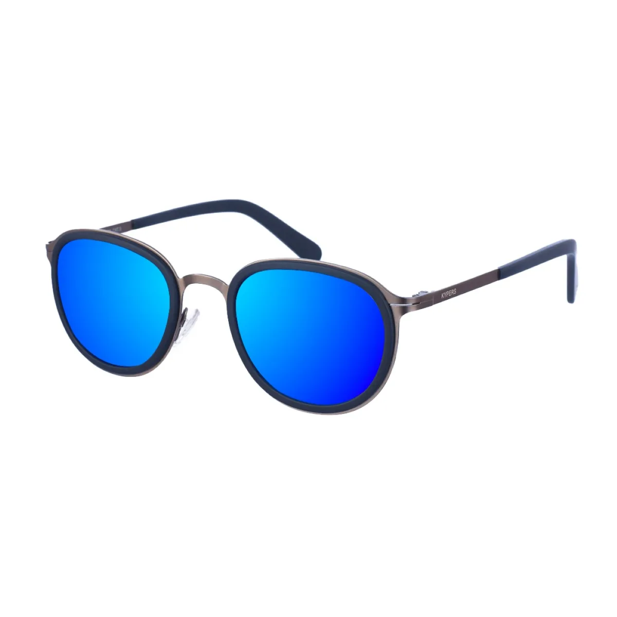 Kypers zonnebril met metalen montuur. Ovaal van vorm. Metalen veren met acetaat afwerking, met de merknaam gegraveerd. 100% UV-bescherming. Antireflecterende glazen. Inclusief stoffen beschermhoes. Afmetingen: Hoogte lens: 44 mm. Breedte lens: 47 mm. Brug: 21 mm. Veren: 138 mm. Samenstelling: Metaal Onderhoud: Reiniging en onderhoud: -Reinig de glazen met water en zeep (neutraal). - Gebruik geen vuile of schurende doekjes, die kunnen de eigenschappen van de filters veranderen. - Gebruik alleen originele accessoires en reserveonderdelen.