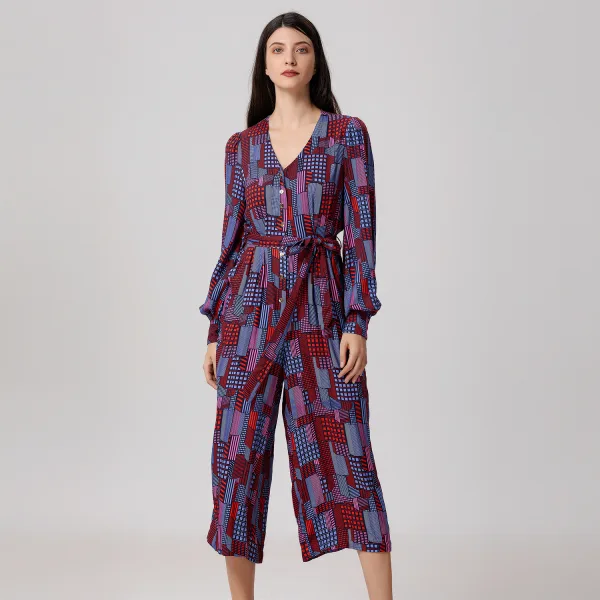 Deze jumpsuit heeft een snit die zowel eenvoudig als verfijnd is: gestructureerd met een knoop aan de voorkant, pofmouwen en een V-hals. Taille geaccentueerd door een toegevoegde riem. Een grafisch en vrouwelijk exemplaar met een geometrische patroonprint. Geschikt tussenseizoen voor alledaagse gelegenheden, stadsgelegenheden of meer feestelijke dansevenementen. Productdetails: Vorm: recht, getailleerd Lengte: 125 cm Lange mouwen Zijzakken Knoopsluiting middenvoor