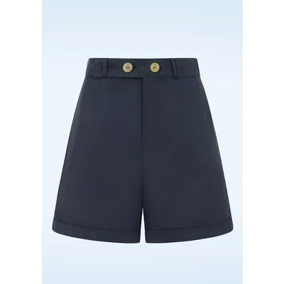 De zomer komt er aan, tijd om je beentjes te showen! Dit retro modelletje draag je hoger in de taille en heeft korte pijpjes afgewerkt met een speels omslagje die super flatterend staat bij zowel dames met slanke benen als dames met curvy benen ;-) Uitgevoerd in een stevige maar aangename, navyblauwe viscosemix (stretcht amper) dat perfect is voor het aankomende seizoen. ''Life's too short, to not wear shorts!'' * Hoog taille model * Knoop- en ritssluiting voorzijde * Riemlussen * Zijwaartse steekzakken * Ietwat wijdere pijpjes * Omslagjes