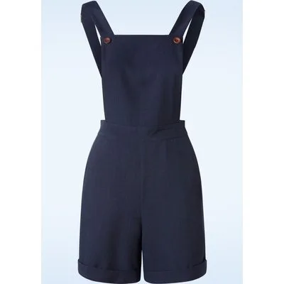 ”La vie en blue” Deze playsuit is uitgevoerd in een stevig en soepel, marineblauw stofje, die heerlijk comfortabel draagt. * Verstelbare schouderbanden * Decoratieve knopen voorzijde * It has pockets! * Blinde rits met haaksluiting achterzijde * ‘Faux’ paspelzakjes aan achterzijde * Korte, wijde pijpen met vaste omslagjes