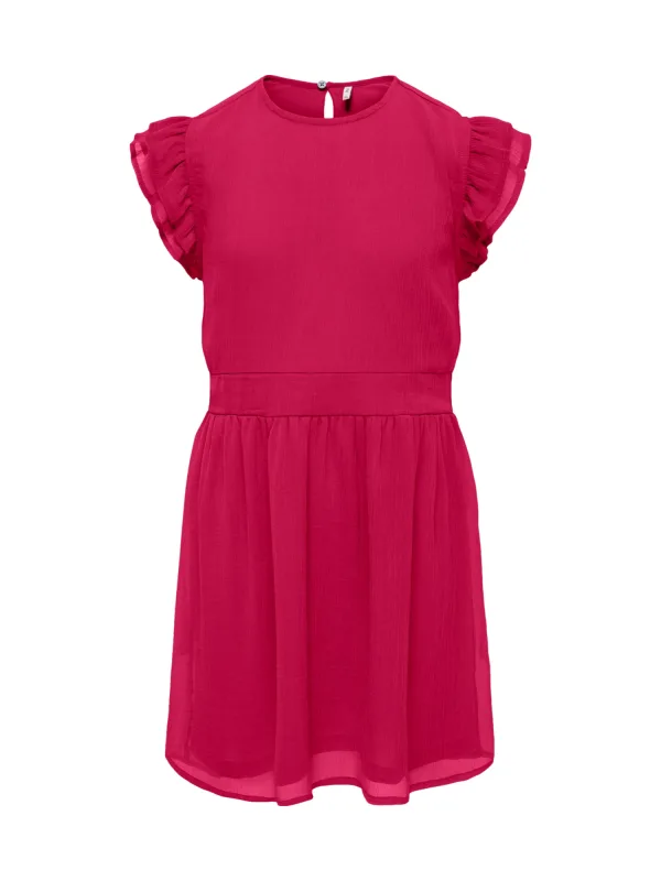 Deze jurk met ruches voor meisjes combineert een elegante stijl met lieflijke details. De korte pofmouwtjes geven het ontwerp een speelse luchtigheid. De elegante snit creëert een prachtig silhouet. Een dubbellaagse stof die aangenaam zacht aanvoelt op de huid. De fijne omgeslagen zoom benadrukt de hoogwaardige afwerking. Een ton-sur-ton tailleband fungeert als een optische riem en voegt een subtiel accent toe. De ruches geven de jurk levendige beweging. Een knoopsluiting aan de achterkant vergemakkelijkt het aan- en uittrekken. Het ontwerp wordt afgerond met een stijlvolle labelpatch.