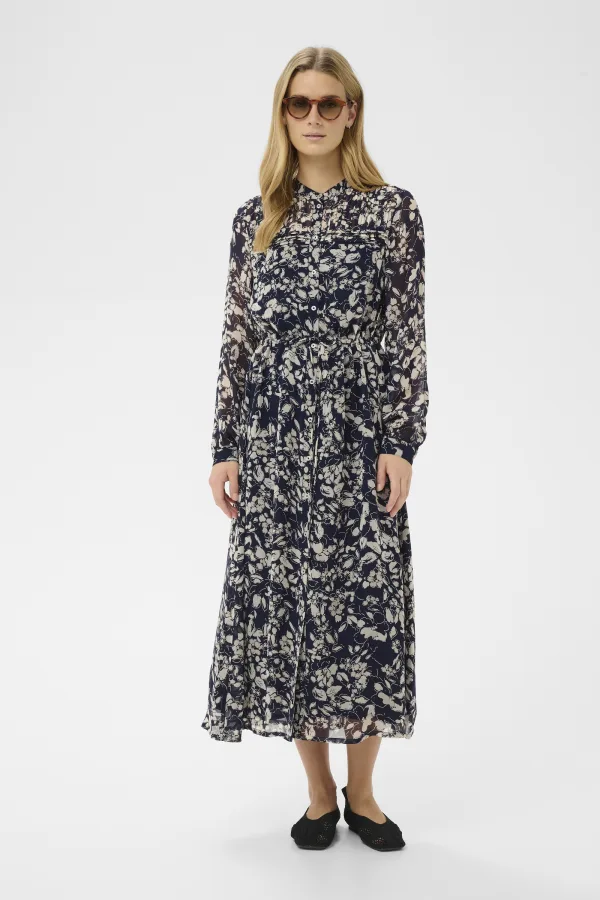 Overhemdjurk met all-over print, knoopsluiting en taillekoord. Lange mouwen, midi-lengte en soepel vallende pasvorm geven een eigentijdse look.