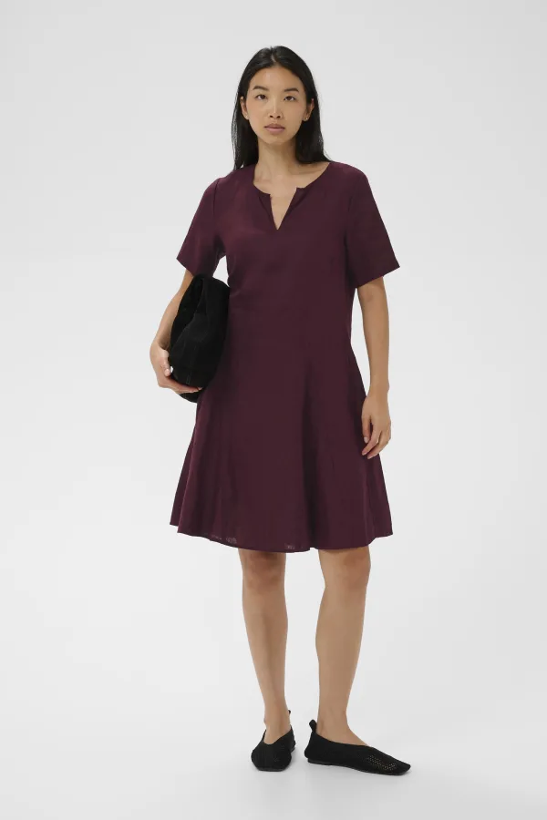 Jurk met korte mouwen en licht uitlopende A-lijn. Voorzien van een moderne split-hals, zachte structuur en handige zijzakken.