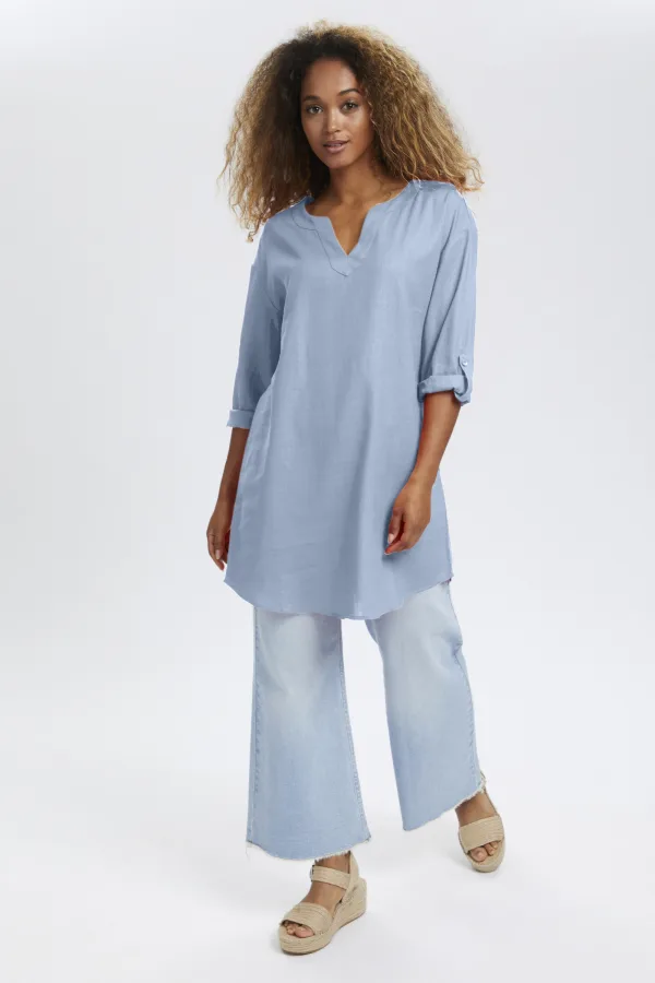 Tuniek top met recht, soepel silhouet, V-hals met inkeping en lange mouwen met knoopdetail. Zachte, gladde uitstraling en bovenbeenlengte.