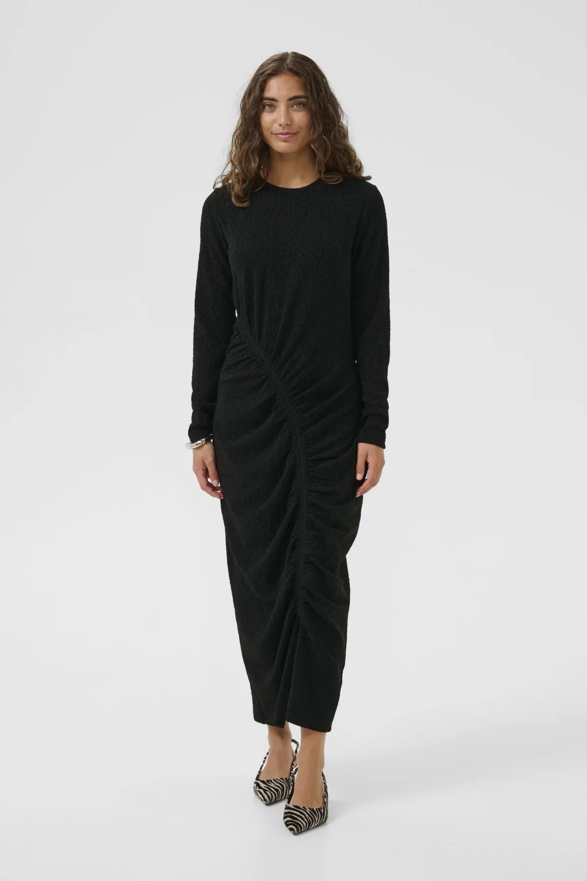 Deze damesjurk met lange mouwen heeft een nauwsluitende pasvorm, een ronde hals en opvallende plooidetails. Dankzij het comfortabele ontwerp is de jurk geschikt voor zowel informele als formele gelegenheden.